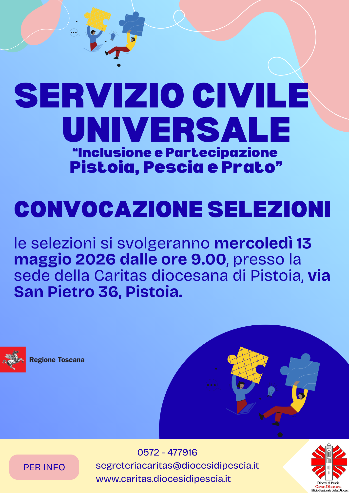 Convocazione per la selezione dei candidati che hanno presentato domanda per il Bando di Servizio Civile Universale con scadenza 8 aprile 2026 (prorogata al 16 aprile), per chi ha presentato correttamente la domanda è stata resa nota la data per le selezioni che si svolgeranno mercoledì 13 maggio 2026 dalle ore 9.00, presso la sede della Caritas diocesana di Pistoia, via San Pietro 36, Pistoia.